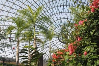 園内にある直径50m、高さ21mのドーム型でガラス張りの大温室“フラワードー”は、とっとり花回廊のメイン施設。天候に左右されることなくいつでも綺麗な花や植物を見ることができます。