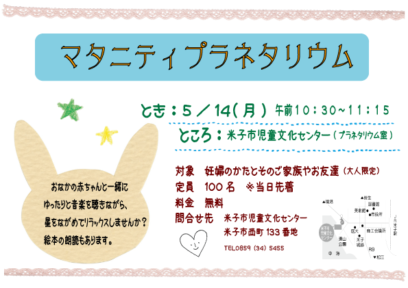 妊娠中のかたとそのご家族(大人限定)を対象に、プラネタリウムで優しい音楽とともに星の解説と絵本の朗読を行います。おなかの中の赤ちゃんと一緒にリラックスしてお過ごしください。無料ですのでお気軽にお越しください♪