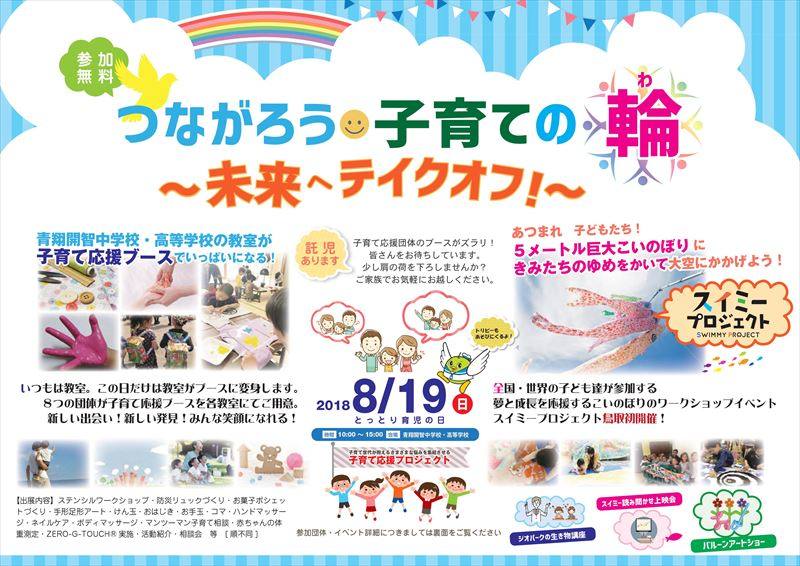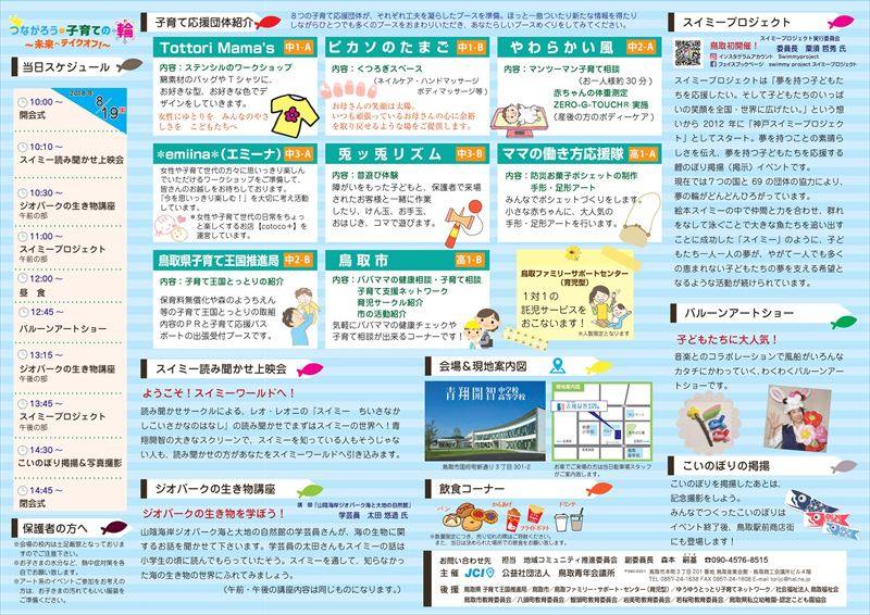 多くの参加者、協力者が笑顔でつながり、地域を挙げての更なる子育てしやすい環境に向けての活動となります。鳥取初のスイミープロジェクトをはじめ、子育て応援のブースが大集合~!
