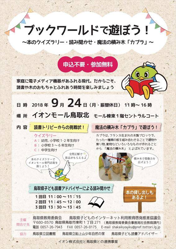 イオンモール鳥取北で、「ブックワールドで遊ぼう!」が開かれます。家庭に電子メディア機器があふれる現代。だからこそ、読書や木のおもちゃとふれあう時間を楽しみましょう。本に関するクイズや、木のブロックなどを用意していますので、お気軽にお立ちよりください。