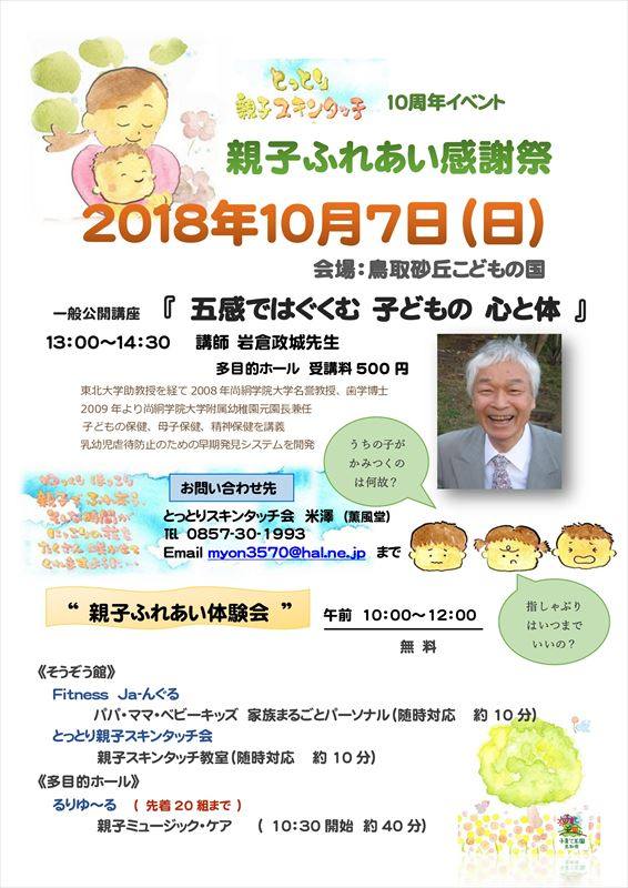 10月7日(日)に鳥取砂丘こどもの国で、とっとり親子スキンタッチ会の10周年イベントが開催されます。講師に岩倉政城先生をお招きして、『五感ではぐくむ 子どもの 心と体』をテーマに一般公開講座が開かれます。