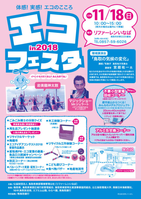 11月18日(日)にリファーレンいなばで、「エコフェスタin2018」が開催されます!当日は、木工体験・リサイクル工作体験・こども遊びコーナーなど、様々なイベントがもりだくさん!ぜひ、遊びに来てください♪