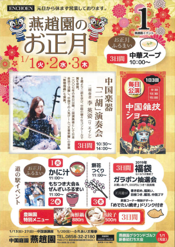 『燕趙園のお正月』1月1日・2日・3日の3日間は「中国楽器二胡演奏会」も公演いたします。その他、道の駅では1日は「かに汁のふるまい」、2日は「ぜんざいのふるまい」など美味しくてあったかものもご用意してお待ちしております♪