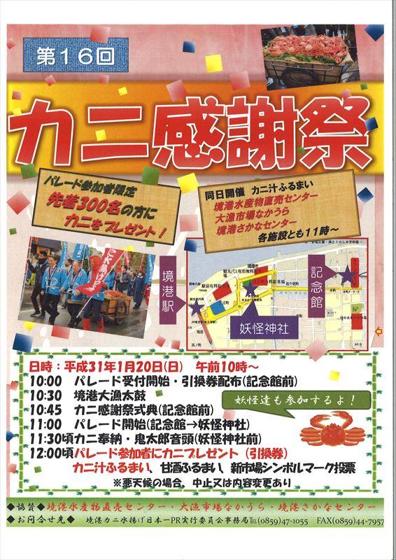 妖怪神社へカニを奉納する「カニ感謝祭」が水木しげるロードで開催されます!カニを山積みにしたリヤカーを、水木しげる記念館前から妖怪神社まで、妖怪の着ぐるみたちと一緒に引っ張りながらパレード♪パレード参加者にはカニがプレゼントされます(先着300名)。妖怪神社前ではカニ汁のふるまいや芸能披露が催されます!