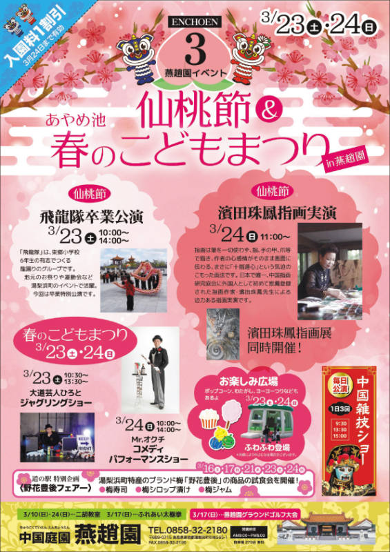 期間中、燕趙園では「仙桃節&あやめ池春のこどもまつりin燕趙園」が開かれます。3/23(土)・24(日)に開催される「春のこどもまつり」では、楽しいショーの開催やお楽しみ広場が登場♪そのほかにも、当日は様々な催しが盛りだくさん!ぜひ、お出かけください。