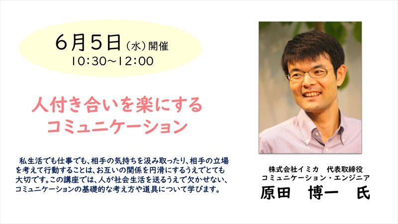 この講座では、人が社会生活を送るうえで欠かせないコミュニケーションの基礎的な考え方や道具について学びます。もっと相手の話をうまく聴けるようになりたい方、上司部下や同僚など、職場での人間関係をよりよくするスキルを習得したい方、家族や友人など日常生活のコミュニケーション力を高めたい方などにおすすめです。