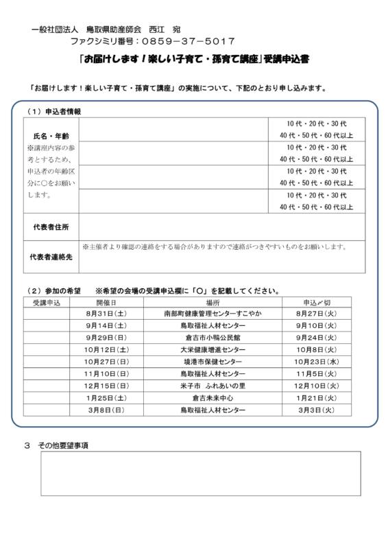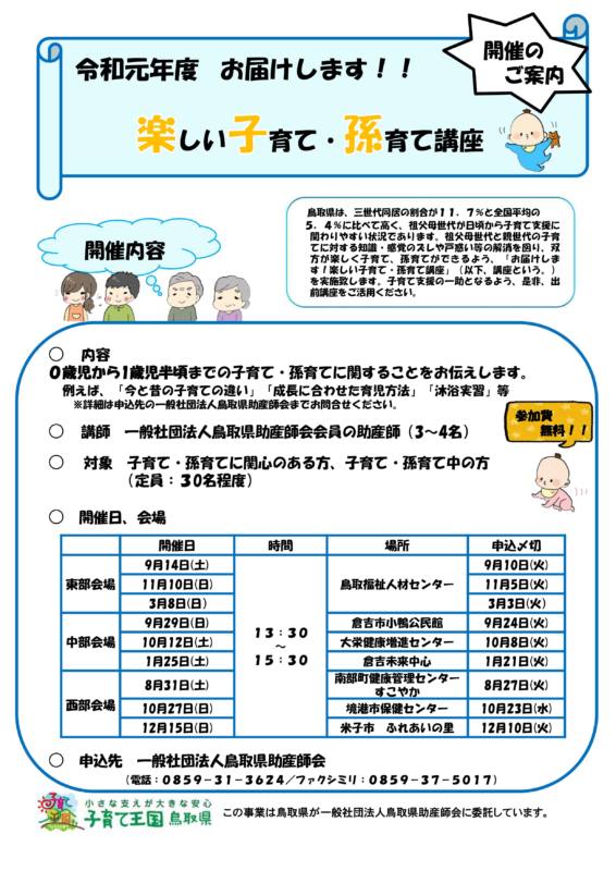 鳥取県は、三世代同居の割合が11.7%と全国平均の5.4%に比べて高く、祖父母世代が日頃から子育て支援に関わりやすい状況です。これに踏まえ、祖父母世代と親世代の子育てに対する知識・感覚のズレや戸惑い等の解消を図り、双方が楽しく子育て、孫育てができるよう、「お届けします!楽しい子育て・孫育て講座」を実施いたします。ぜひ、ご参加ください。