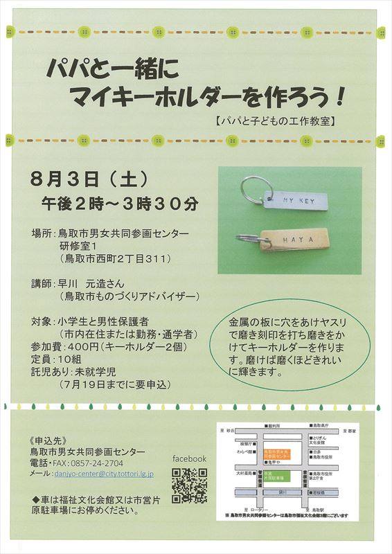 金属の板に穴をあけヤスリで磨き刻印を打ち磨きをかけてキーホルダーを作ります。親子・ご家族で、ぜひ、ご参加ください。