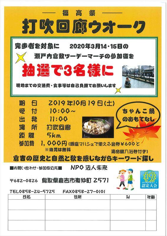 倉吉市で行われる『福高祭』の企画内のウオーク部門として、「打吹回廊ウオーク(5km)」が開催されます!参加者の特典で、ちゃんこ鍋の振る舞い、銀座マルシェで使える金券(600円)、湯命館入浴券が付いてくる嬉しい特典があります。親子、ご家族、お友達同士でご参加ください♪