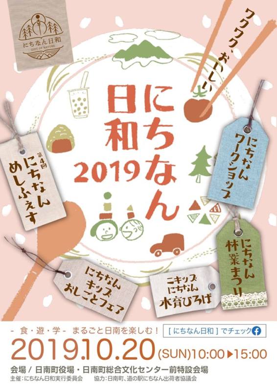 日南町の「食」のみならず、自然、文化、観光など、日南町の魅力をまるごと詰め込んだ子どもから大人まで楽しめるイベント「にちなん日和2019」が日南町役場前で開催されます!小さなお子様も安心してご来場いただける木育広場のオープン!!ぜひ、お出かけください♪
