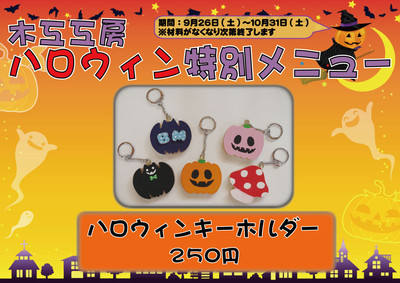 10月といえばハロウィンです。工房でハロウィンにちなんだ作品を作ってみませんか?各工房で工作をしてくれた方にひとり一枚、木で作ったハロウィンパーツをプレゼントします♪