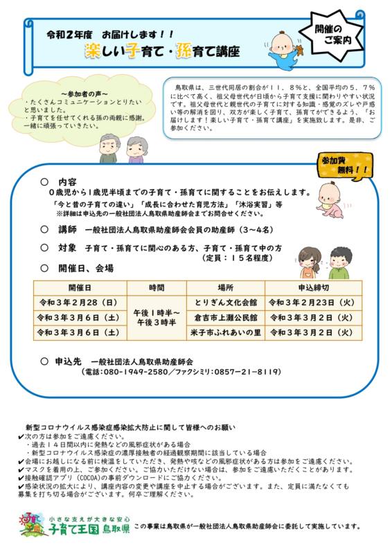 祖父母世代と親世代の子育てに対する知識・感覚のズレや戸惑い等の解消を図り、双方が楽しく子育て、孫育てができるよう、「お届けします!楽しい子育て・孫育て講座」を実施致します。是非、ご参加ください。