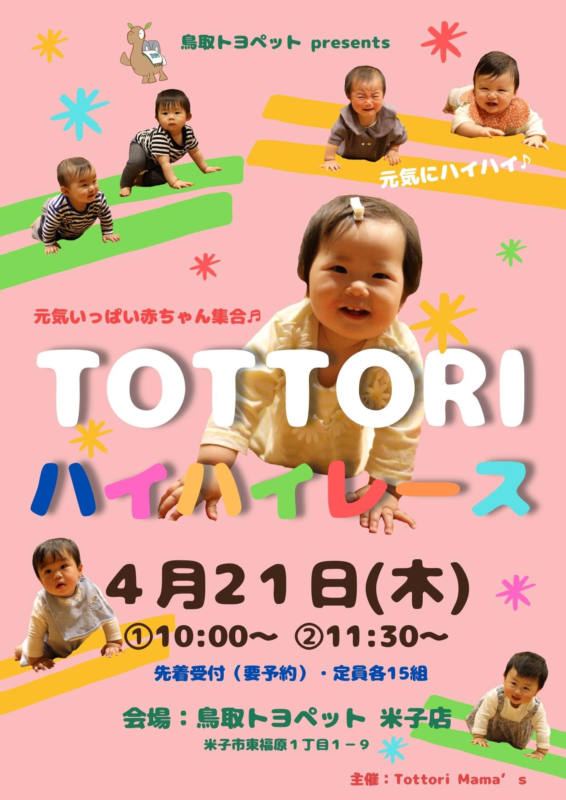 鳥取トヨペットpresents『TOTTORI ハイハイレース』は、子育てを応援したい・地域を盛り上げたい鳥取の企業様と子育て真っ最中の鳥取の女性たちが一緒に創り上げる企画です。赤ちゃんの御参加お待ちしております♪