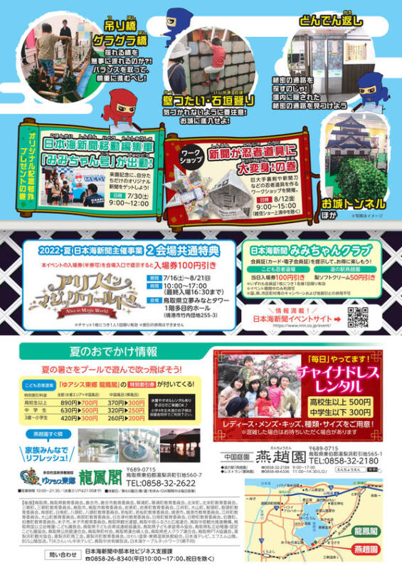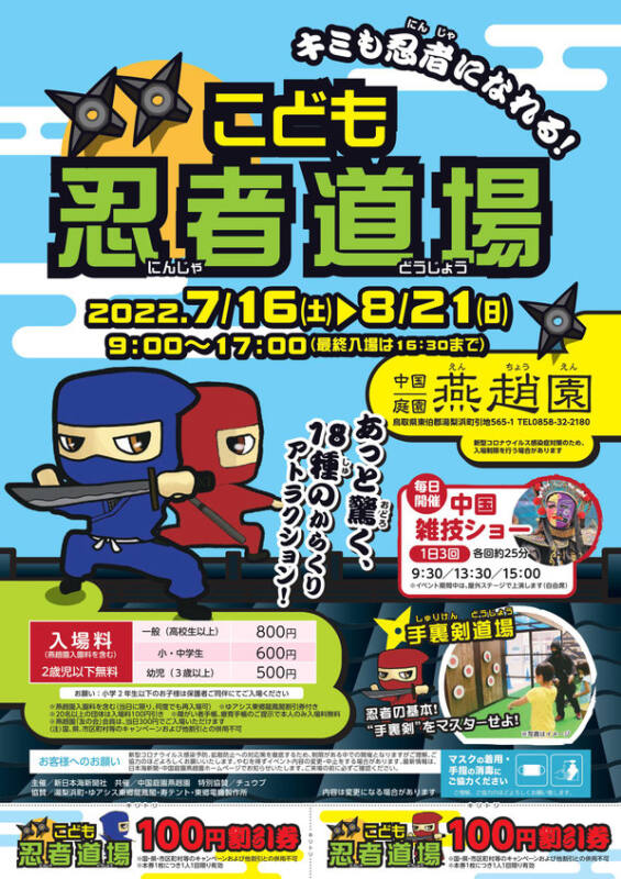 期間中、湯梨浜町にある中国庭園燕趙園で日本海新聞社共催イベント「こども忍者道場」を開催しています!手裏剣や石垣のぼりなど全18種類のからくりアトラクションが登場!忍者になりきってアトラクションに挑戦しよう!ご家族そろってお楽しみください♪