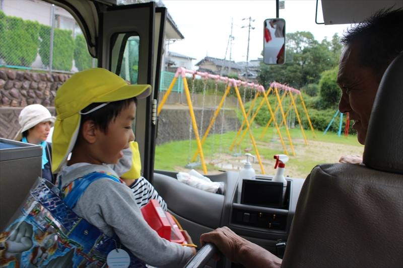 (写真左)目標の川までは、バスに乗って移動♪運転手さんにもお礼のごあいさつ。