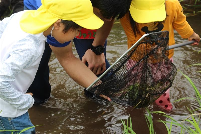 先生がまだ何も採れていない様子の園児たちに声をかけ、園児を集めて作戦会議。横一列に並んで追い込み作戦決行~!みんなで協力し合い、園児の持つタモの中には生き物がかかり作戦成功です!「タモに何か入った!!」