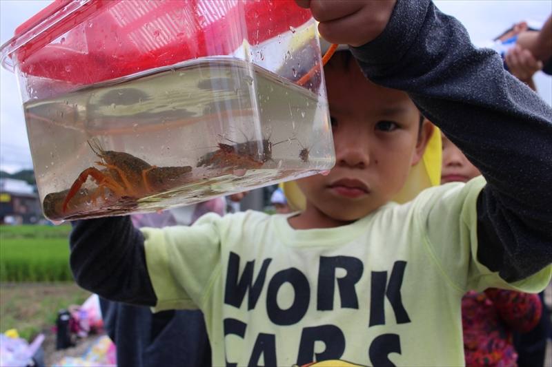 ザリガニを手で掴んで、とても嬉しそうです。「ザリガニが採れた!」