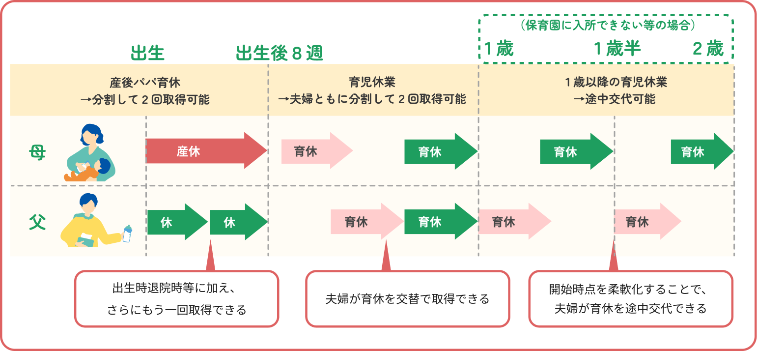また、父親も出産後8週間以内に最大4週間まで2回に分割して取得することが可能な「産後パパ育休」の制度があります。