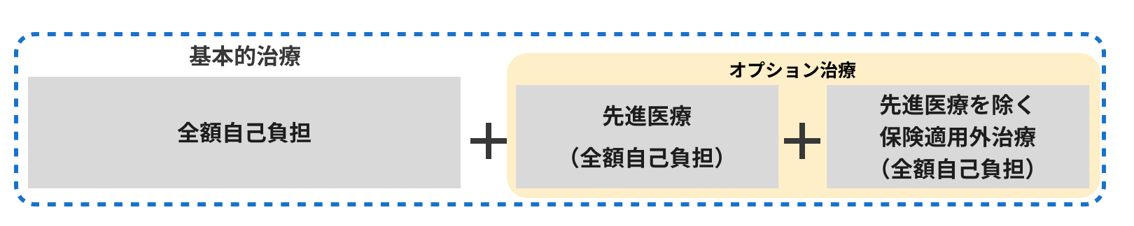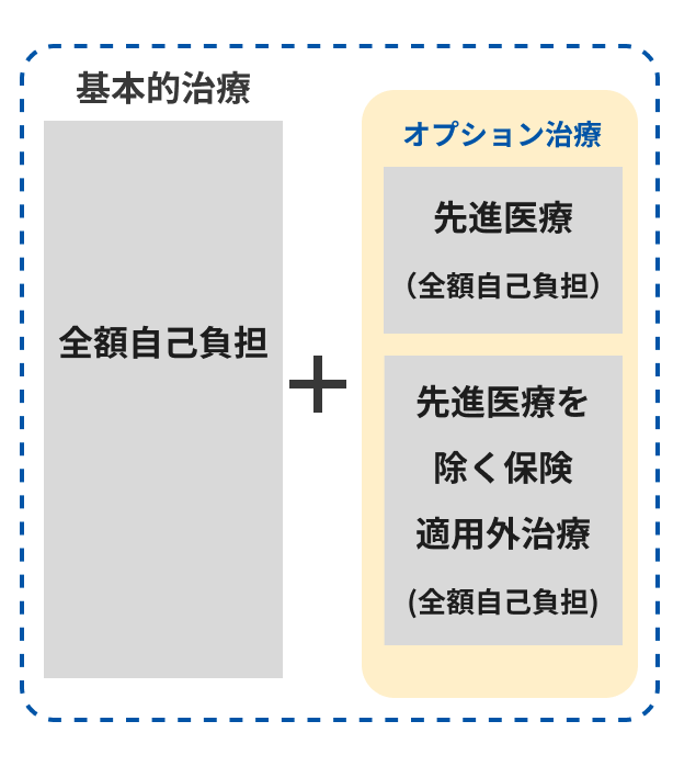 保険適用による治療と、保険適用外治療(先進医療を除く)を組み合わせて実施すること(混合診察)はできません。そのため、治療内容に、保険適用外治療(先進医療を除く)が含まれる場合は、基本的な治療を含め、全額自己負担(自費診療)となります。