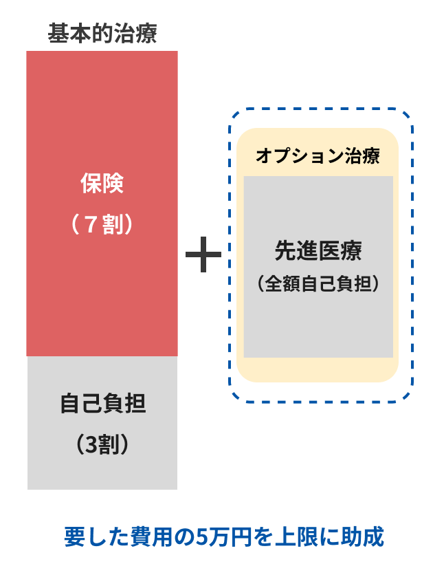 保険適用とならない治療のうち、先進医療と認められたものについては、保険適用による治療と組み合わせて実施することができます。先進医療に係る費用については、全額自己負担となり、その費用に対して助成します。