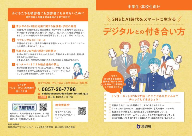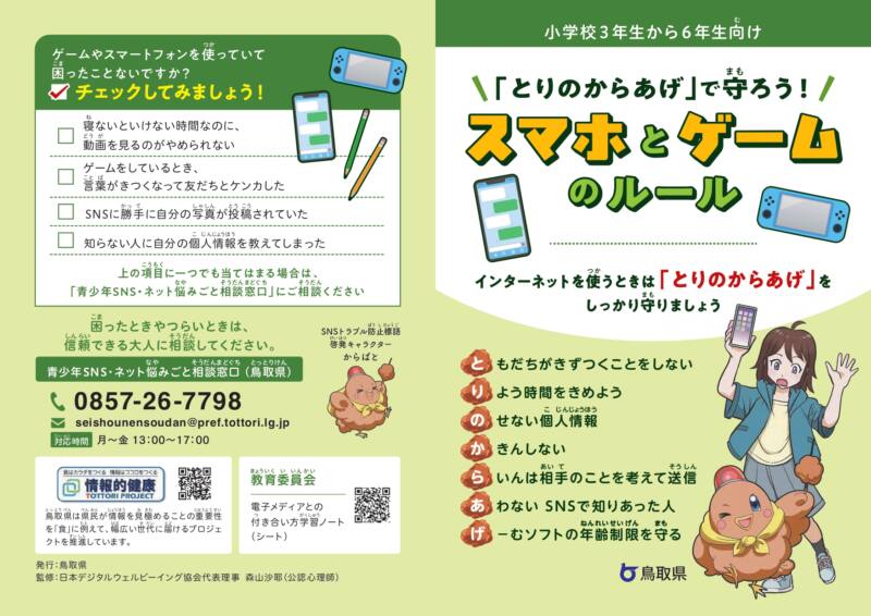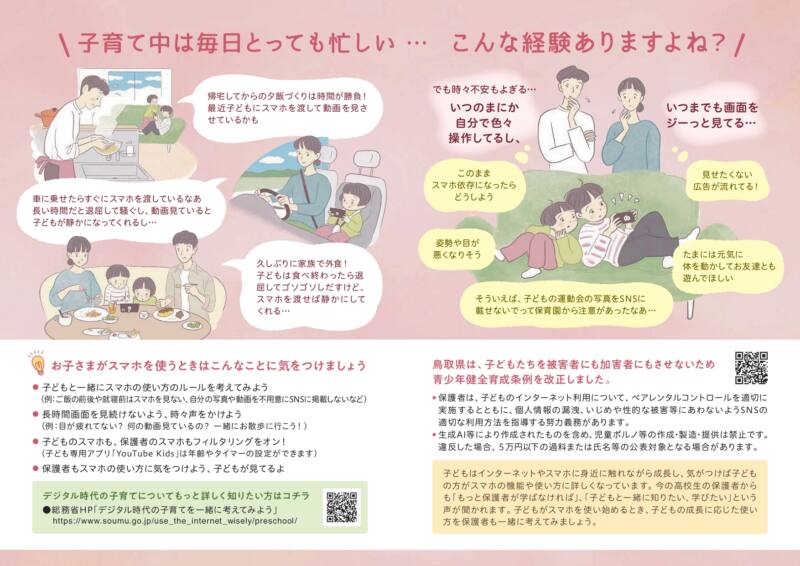 全国的に、子どもがスマホやSNSによりトラブルに巻き込まれることが増加しています。鳥取県では、こうしたトラブルや被害から子どもを守るためリーフレットを作成しました。