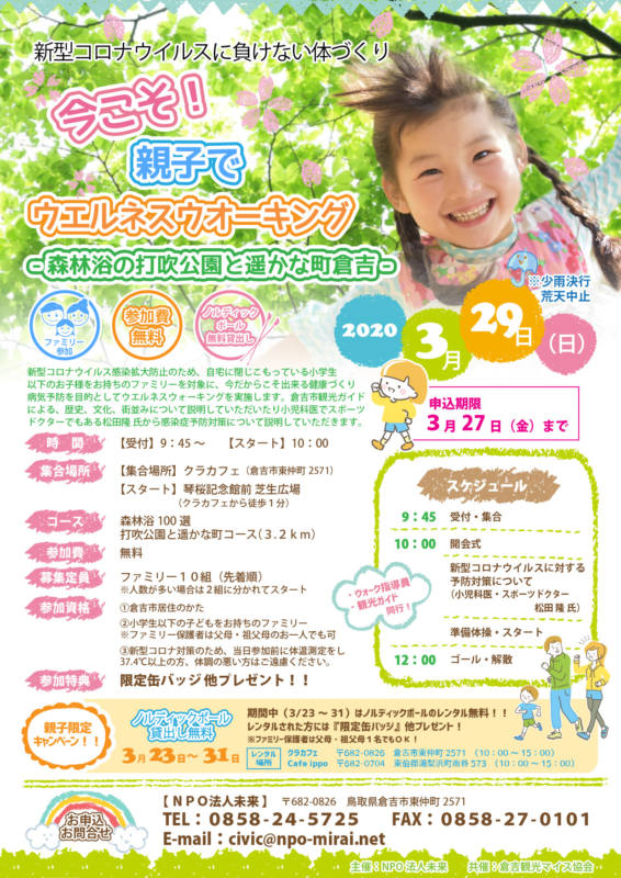 【※ウエルネスウォーキングのご参加は、鳥取県中部地区にお住まいの小学生以下のお子様をお持ちのファミリーを対象としていますが、期間中(3/23~3/31)、県内に居住されているご希望のファミリーには、随時、クラカフェにてノルディックポールの無料貸し出しを実施します。(参加者特典あり)詳細は、その他をご覧ください。】