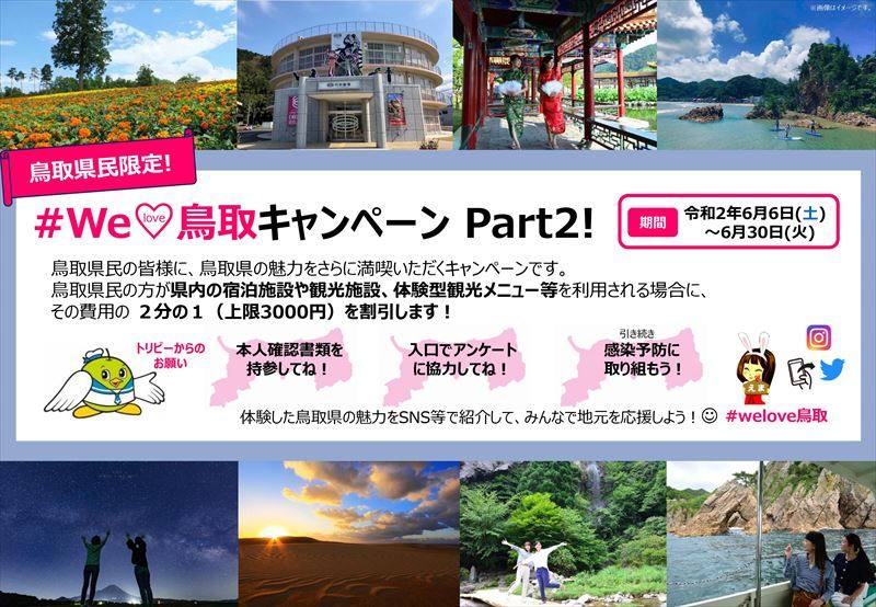 「#WeLove鳥取キャンペーン」の第2弾として、鳥取県民の皆様が対象の県内宿泊施設や観光施設等を利用される場合の費用を2分の1(上限3000円)割引する「#WeLove鳥取キャンペーンPart2」を6月6日(土)から実施しています。体験した鳥取県の魅力をSNS等で紹介して、みんなで地元を応援しよう!(※SNS等での紹介は必須ではありません。)