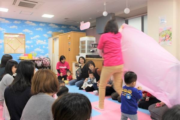 「♪歌と絵本タイム♪」は、0歳から2歳までの子どもを対象に季節の歌やお話し、親子ふれあい遊びなどをして親子で楽しい時間を過ごします。まずは、支援員による絵本タイムから始まり、この日は“赤いだるま”が登場するお話でした。続いて・・・