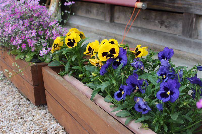 (写真右)プランターに寄せ植えされた季節の花が玄関前を彩っていました。