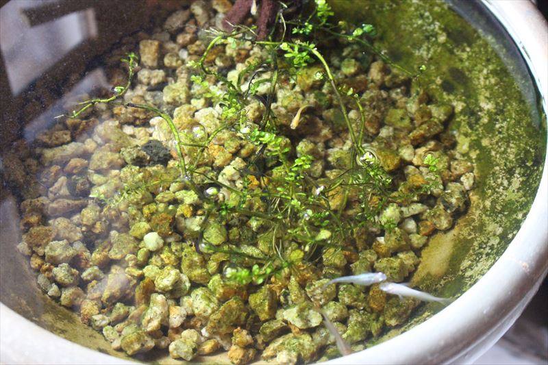 (写真左)玄関口に置かれている睡蓮鉢。水の中をのぞき込むとメダカが泳いでいました♪