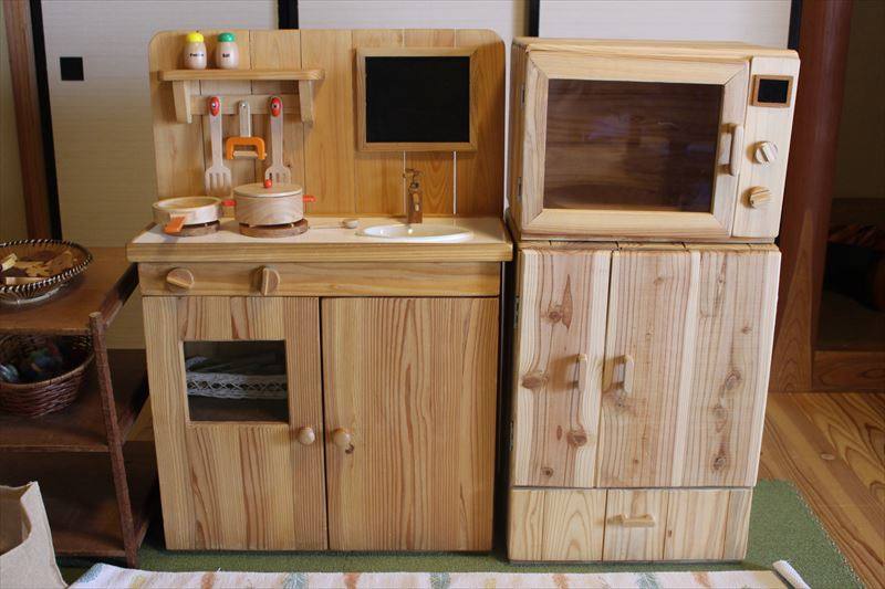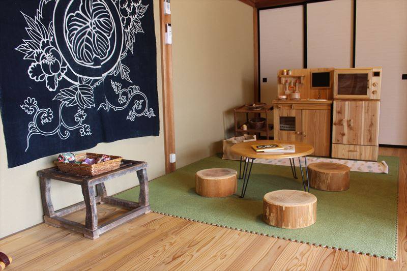 子どもが遊べる手作りの木のおもちゃもあります。小さなキッチンで、おままごとをする子どもの姿も見られます。