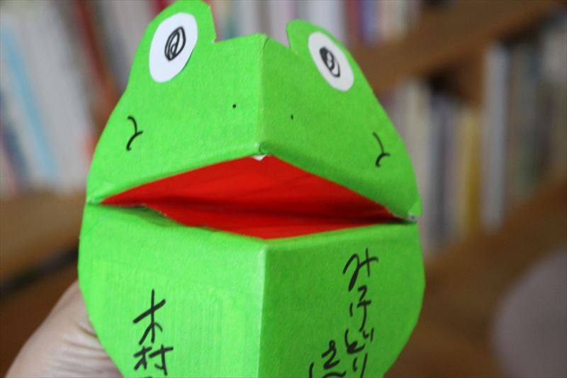 木村さんが作った牛乳パックの「ぱくぱく人形」。次の日も、おもちゃが出来上がるまでの過程を見ていた子どもたちがお店を訪れ、“つくりたい!”と言って、つくって楽しんでいたそうです。作者の木村さんいわく、“何が出来るんだろう”というワクワク感と出来たものを見て“どうやったら作れるんだろう”と考えさせるのも大事なポイントなのだそうです。