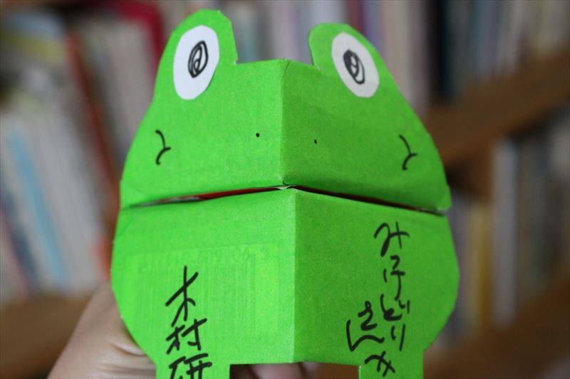 「999ひきのきょうだい」シリーズの作者である木村研さん(鳥取県伯耆町出身)がサプライズ来店された際、突然のワークショップが開催され、はさみと牛乳パックと色紙で木村研さんの手からあっという間に次々とカエルの切り絵やおもちゃが出現!来店していた子どもたちは木村さんのはさみを持つ指先にくぎ付け。次々と出来上るおもちゃに、子どもたちはみるみると笑顔になっていったそうです。