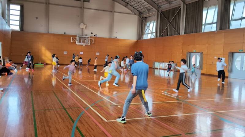 「おやこ劇場版 逃走中」(左)と、「体育館でじんとり&しっぽとり」(右)の様子。