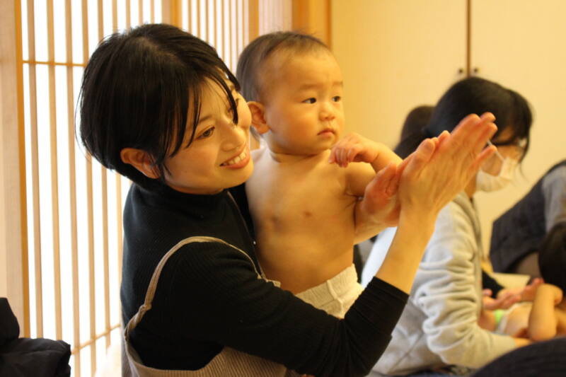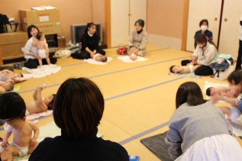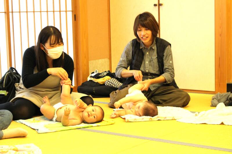 助産師の山根美奈子さんを講師にお迎えし、お母さんと赤ちゃんは、ベビーマッサージを通して親子の絆を深めていました。