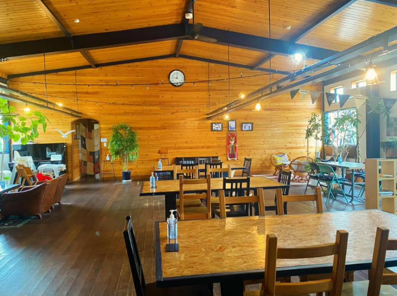 「610キッチン」は倉庫をリノベーションし、木目を基調とした落ち着いた雰囲気で、一人でもファミリーでも幅広い層に親しまれています。心地よい音楽を聞きながら、子どもから大人までどなたでもランチやカフェが楽しめます。